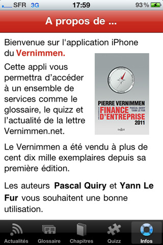 L’application Vernimmen est l’application de l’ouvrage de référence : Finance d’entreprise de Pierre Vernimmen, édition 2011 par Pascal Quiry et Yann Le Fur. En téléchargeant gratuitement l’application vous pourrez accéder à un glossaire de 500 termes financiers, aux résumés des chapitres de l’ouvrage, à un quizz complet pour tester vos connaissances en finance et aux 12 dernières lettres mensuelles du site vernimmen.net.
